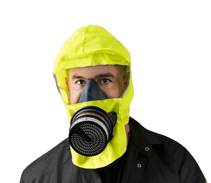Vluchtmasker met filter voor evacuatie in geval van brand en/of een incident met uitstoot van chemicaliën.